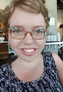 [Image Description: A white girl in her mid-twenties smiles brightly at the camera. She’s visible from the chest up. She wears a black and white patterned dress, multi-colored frames, and has a blond pixie-cut. Behind her is the blurry glimpse of a coffee shop.]