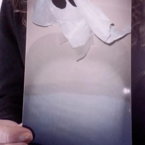 [Image Description: A snapshot showing a paper ghost emerging from a bathtub is held by a white woman obscured by the photo except for part of her hand, a black shirt, and curly brown hair.]