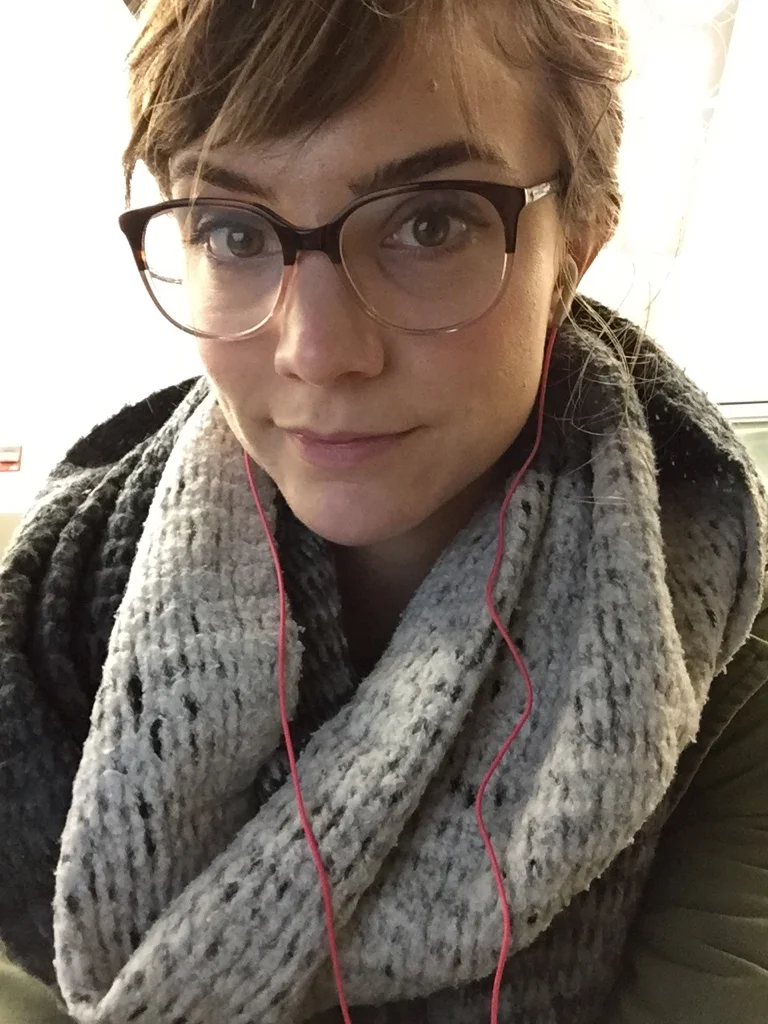 [Image description: The photo is a close-up of a mid-twenties femme-presenting person with pale skin, dark eyebrows, hazel eyes, and a close-lipped smile. Her hair is brown and pulled back with bangs that go to the side on her forehead. She is wearing large glasses with a pink rim on bottom and brown rim on top. She has hot pink earbud headphones in her ears and is a wearing a large, two-tone grey scarf that covers her shoulders and most of her neck.]