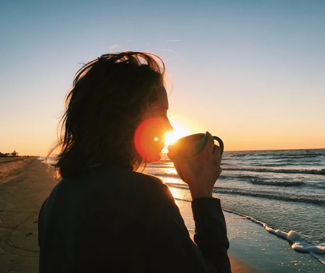 [Image Description: At the edge of an ocean, a young woman with windswept hair looks out over the waves. She is silhouetted by a bright sunrise, rendering most her features indistinguishable—except for a coffee cup she has raised to her lips.]
