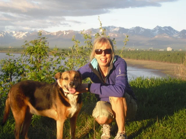 [Image description: A white woman crouches with her Labrador/husky mix dog on the far shores of Cook Inlet in Alaska. The Chugach Mountain range rises in the background.]