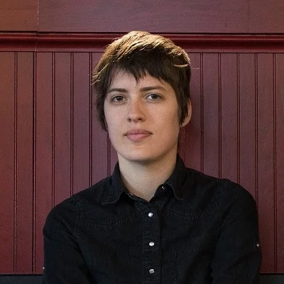 [Image Description: A white queer person with short brown hair and a button-down denim shirt sits down in front of a wooden background.]
