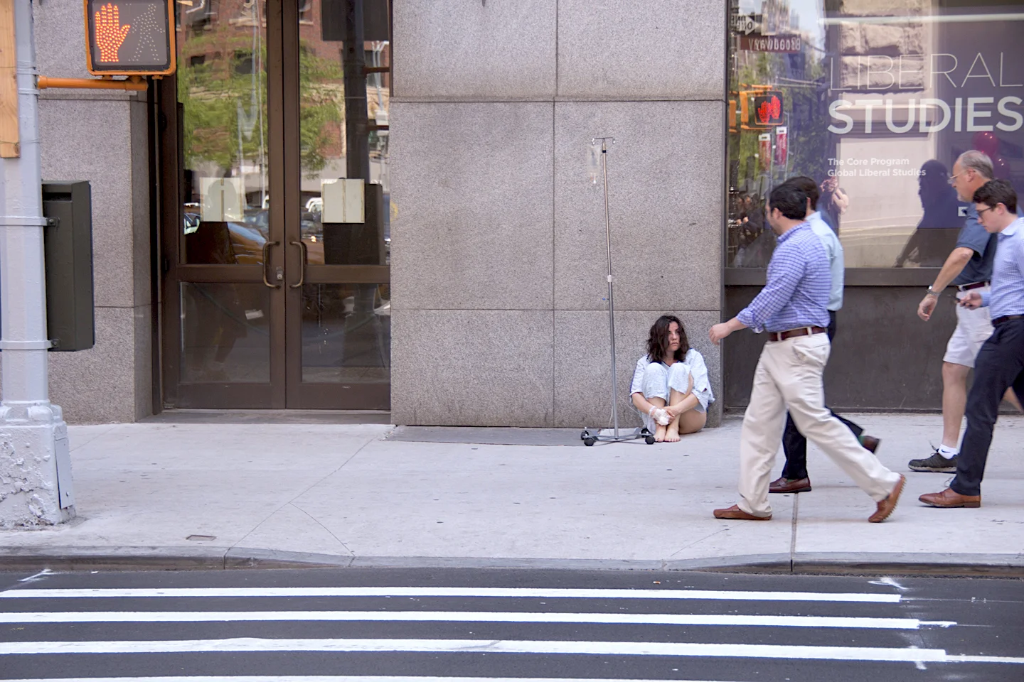 [Image Description: A person sits outside of an office building in the sidewalk with an IV bag beside her as several men pass by.]