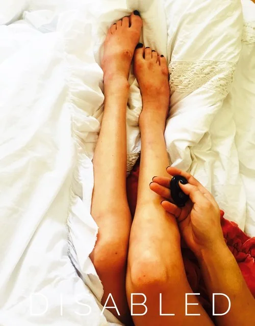 [Image Description: The photo shows Erin's legs and one hand (which holds a small black object), shot from an overhead angle with the knees foreshortened. Her long legs end in twisted ankles and subtly deformed feet decorated with black nail polish. The white rumpled bedsheets and lace beneath her gives the image a sensual feel, was does the visual impact of her flushed golden skin. Sans-serif font reads DISABLED.]
