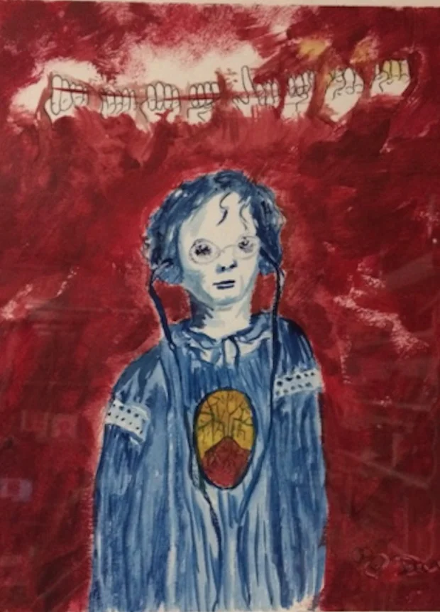 A watercolor painting with a blood red background. In the foreground is a figure painted in blue, with short curly hair, an over-sized sweater with a yellow and red tree design on it, and a serious looking face.