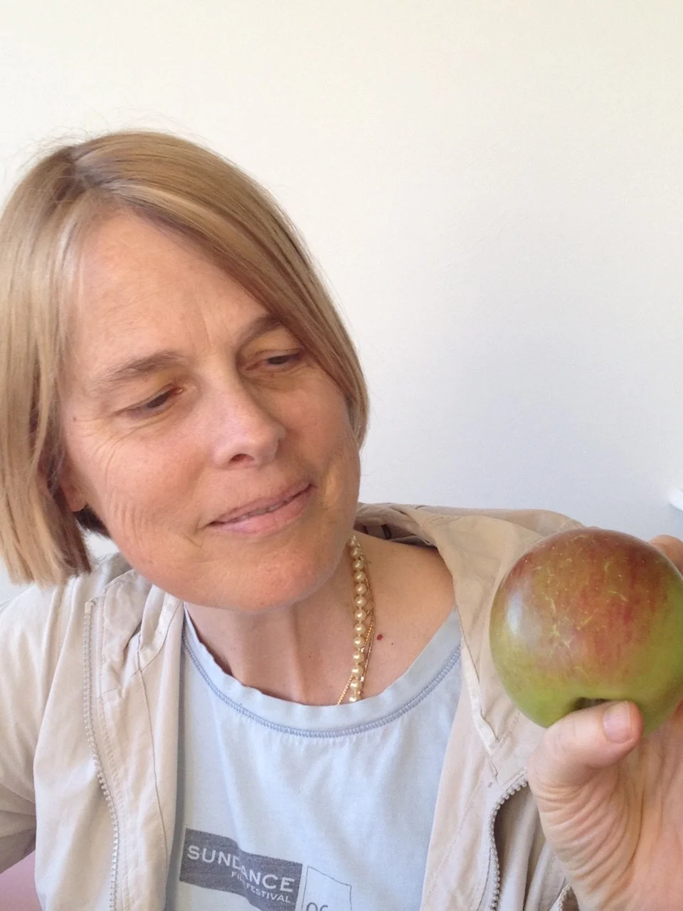 [Image Description: A white woman with a close-cropped strawberry blonde bob smiles in the direction of a red and green apple she holds in her hand. She's wearing a light blue t-shirt under a beige jacket and multiple gold-colored necklaces.]