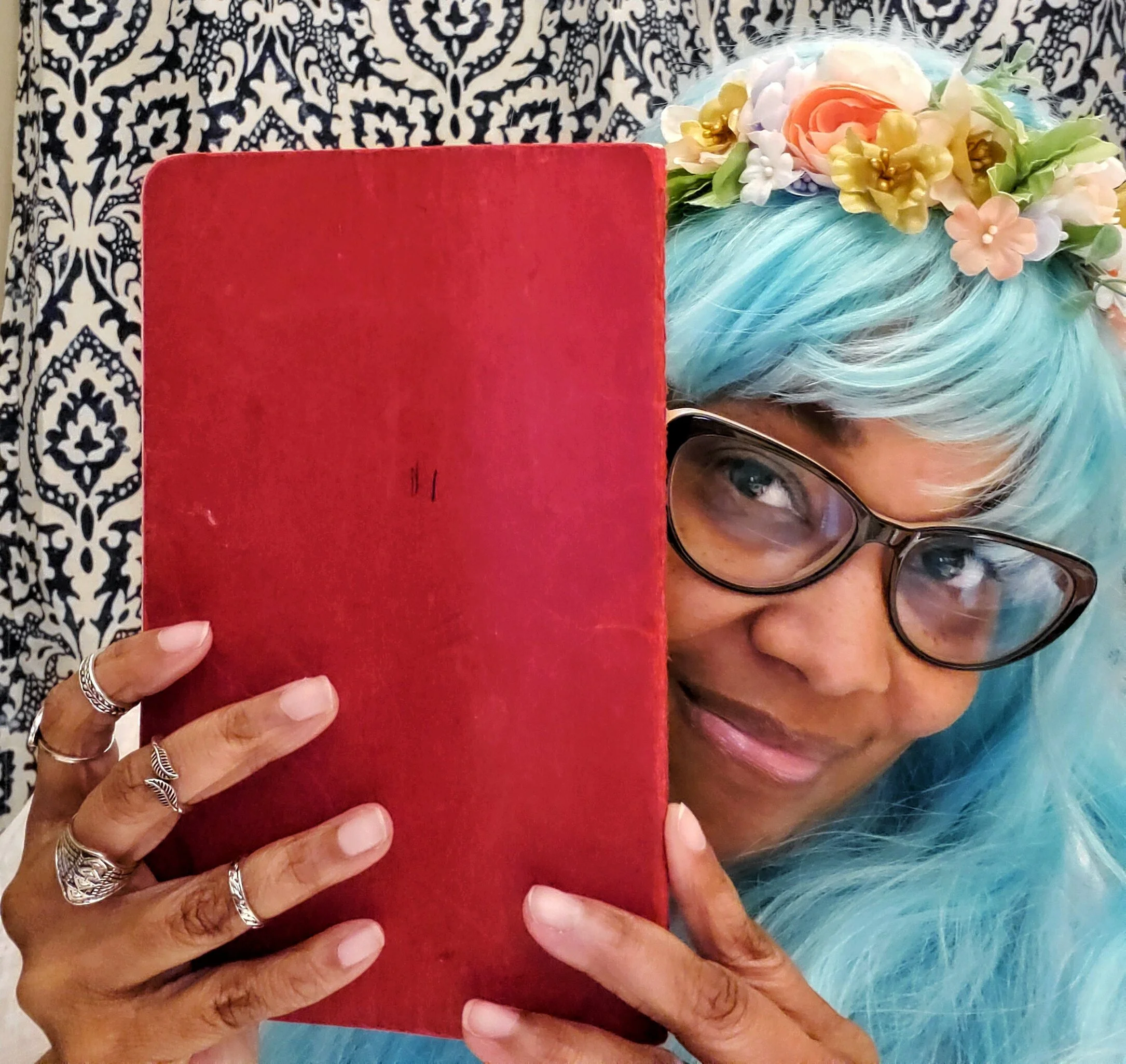 [Image Description: An African-American woman smiles, head tilted to the side, peeking from behind a red book she is holding with both hands. She is wearing black cat-shaped eyeglasses, long blue hair, a flower crown, and silver rings on the fingers of her right hand.]